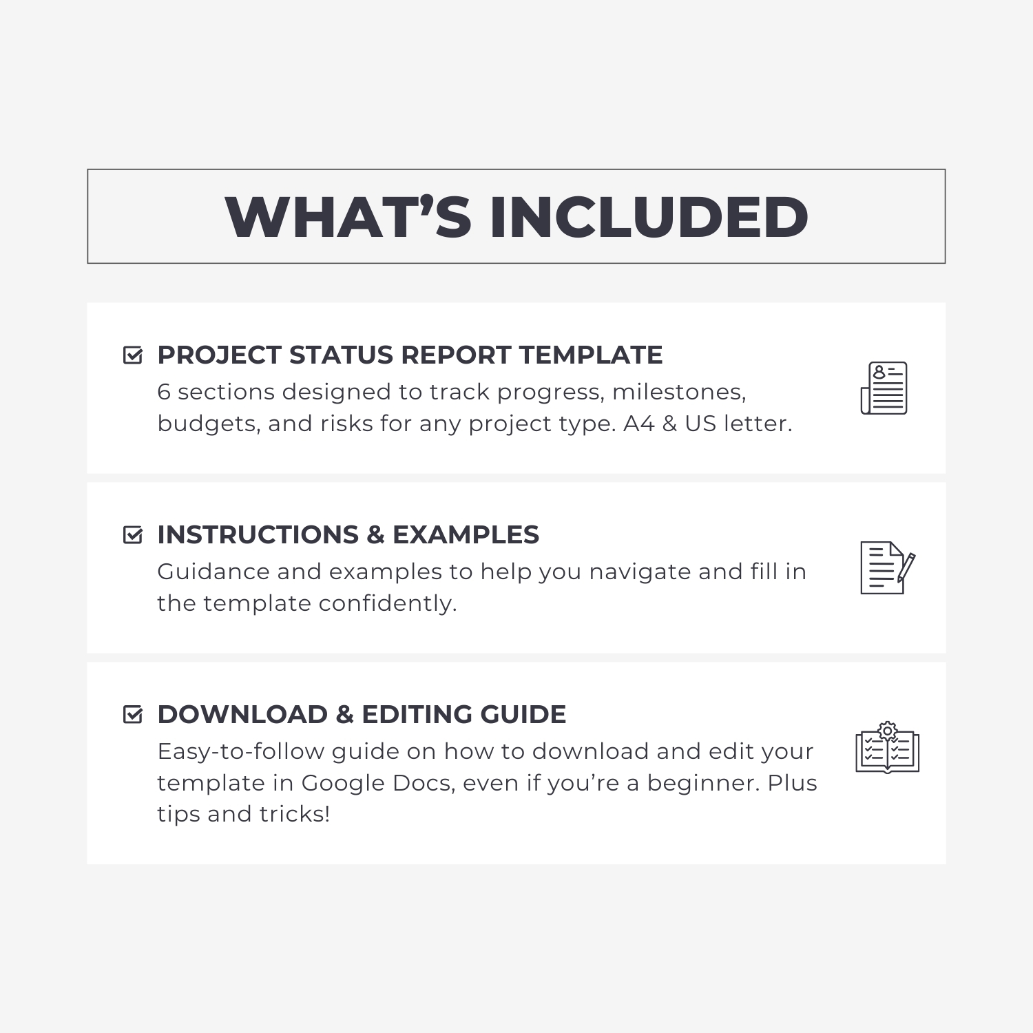 ✅ Customizable and reusable: Tailor the template to suit any industry or project type and reuse it for future projects.